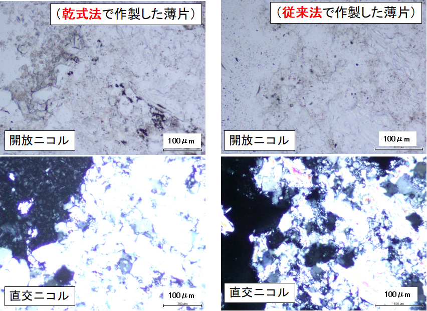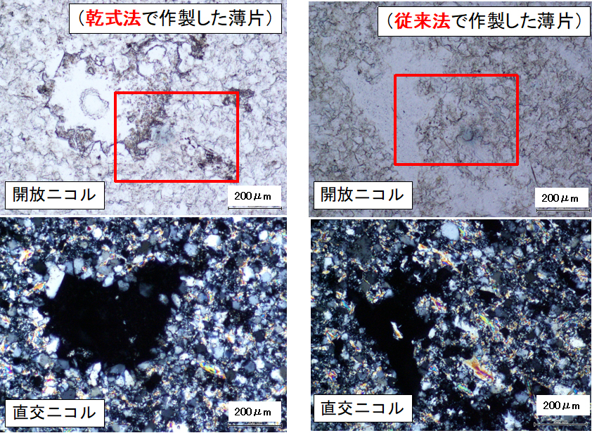乾式研磨法では空孔部に大きさが10~20μmの、レターデーションが低い鉱物粒子(カオリナイト)が確認できる。従来法の薄片では空孔の壁に沿って少量のカオリナイトが認められるのみである。