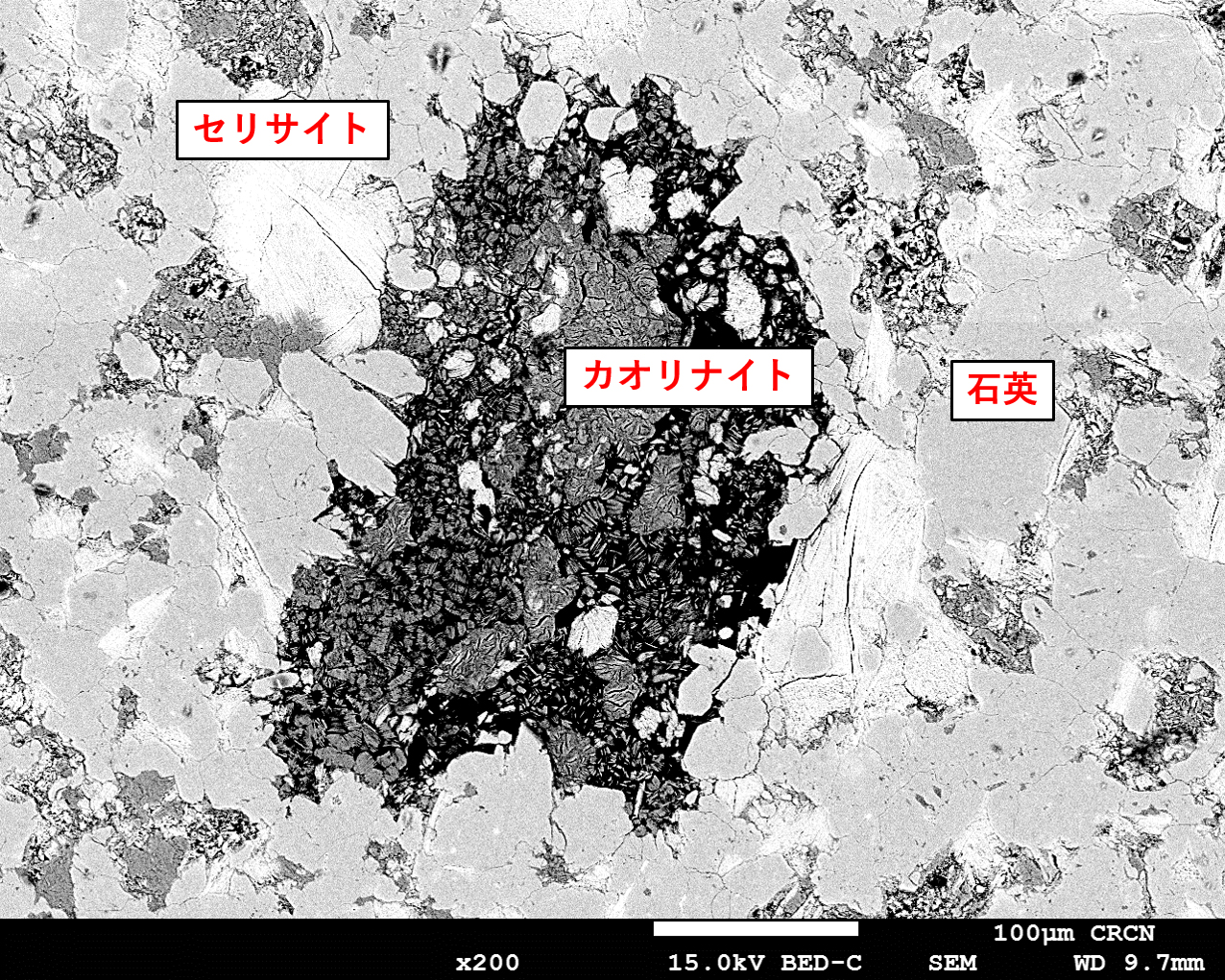 【研磨片観察1】 試料は上記の薄片と同じ「2等石」である。乾式研磨法で作製した研磨片のSEM写真(反射電子像)を図4に示す。空孔の内部に生成した10μm程度の個々のカオリナイト粒子が明瞭に観察できる。このような写真はこれまでに報告された例がなく、粘土鉱物の生成過程を推定する重要なデータである。