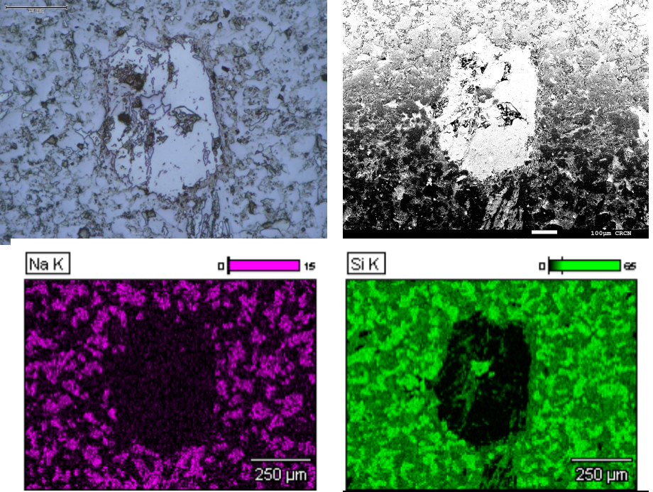 左上:偏光顕微鏡写真(反射光)、右上:SEM写真(二次電子像)、左下:特性X線像(Naの分布を表示)、右下:特性X線像(Siの分布を表示)