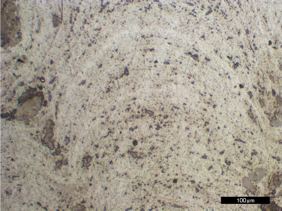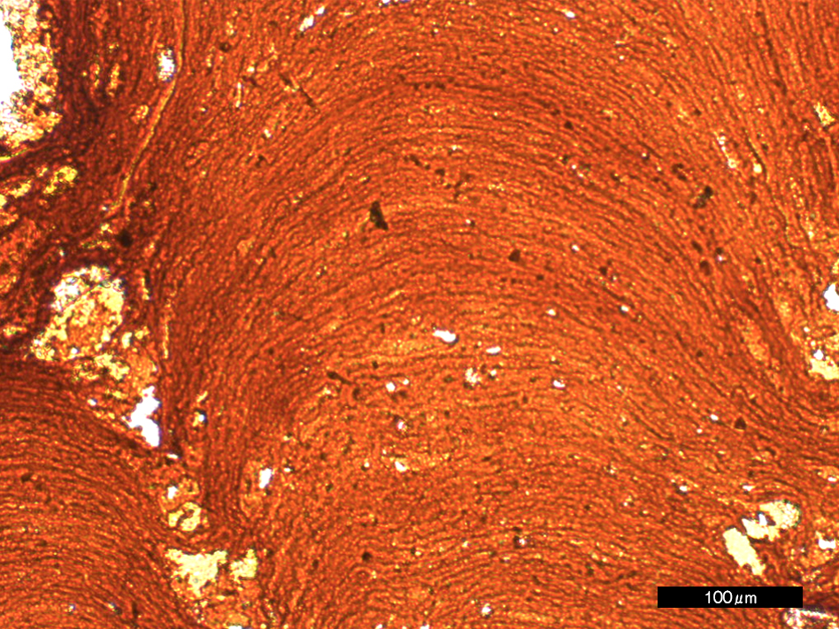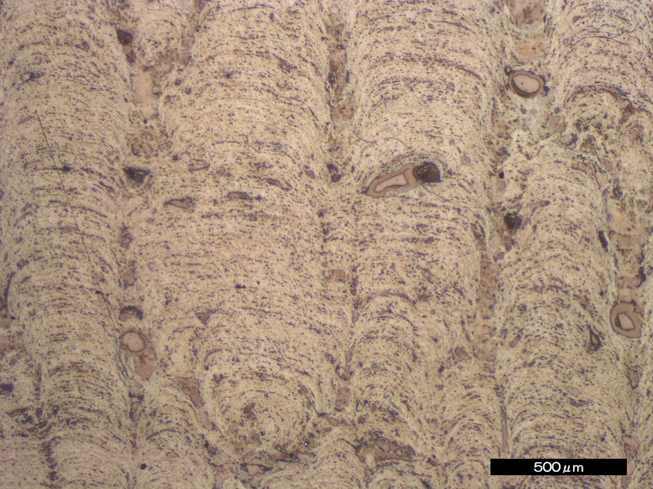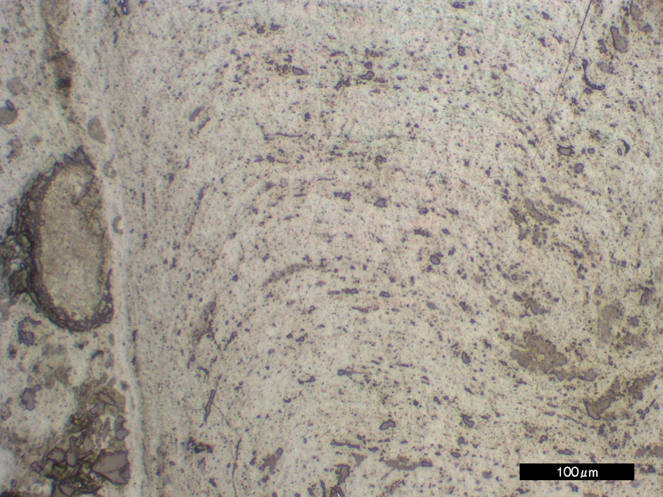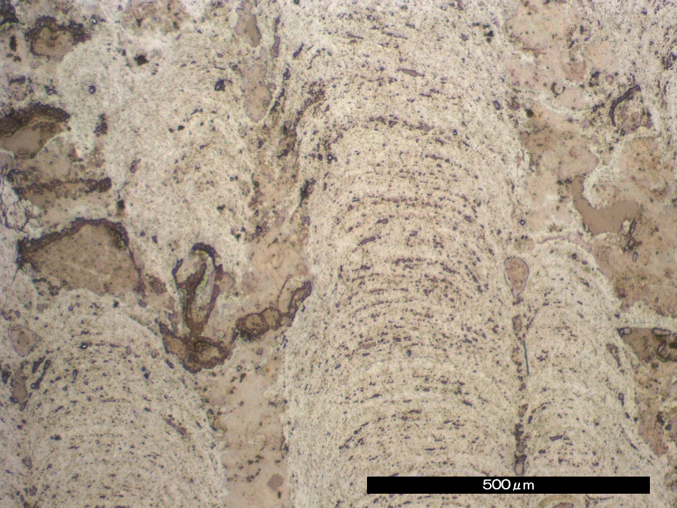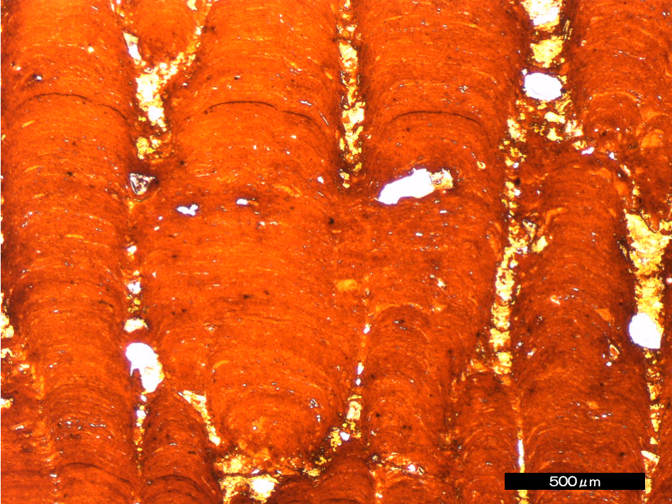 北西太平洋域には、海水から生成する鉄マンガン酸化物の塊が広く分布している。これは普通の海水からゆっくりと(1000年に5ミクロン程度)沈殿し続ける半固結の化学堆積岩である。レアメタルを吸着した鉄・マンガン酸化物を主成分とし、ほかに、陸源の鉱物粒子(石英,長石など) ,生物の骨格(有孔虫、放散虫)、火山岩片、宇宙塵など、多種多様の鉱物を含んでいる。“長レンジの海洋コア”としても注目され、過去の地球表層環境変化やイベントを記録する堆積物として期待されるものの、高い含水率と空隙率を示し、その構成粒子は多様な粒径,硬度と複雑な成長組織を持つため、検鏡用の試料作製は至難の技である。写真は乾式研磨法によるクラストの研磨面(左)と透過像(右)である。かつては観察できなかった、クラスト中の磁鉄鉱粒子や数ミクロン間隔の縞模様などまで観察できるようになった。